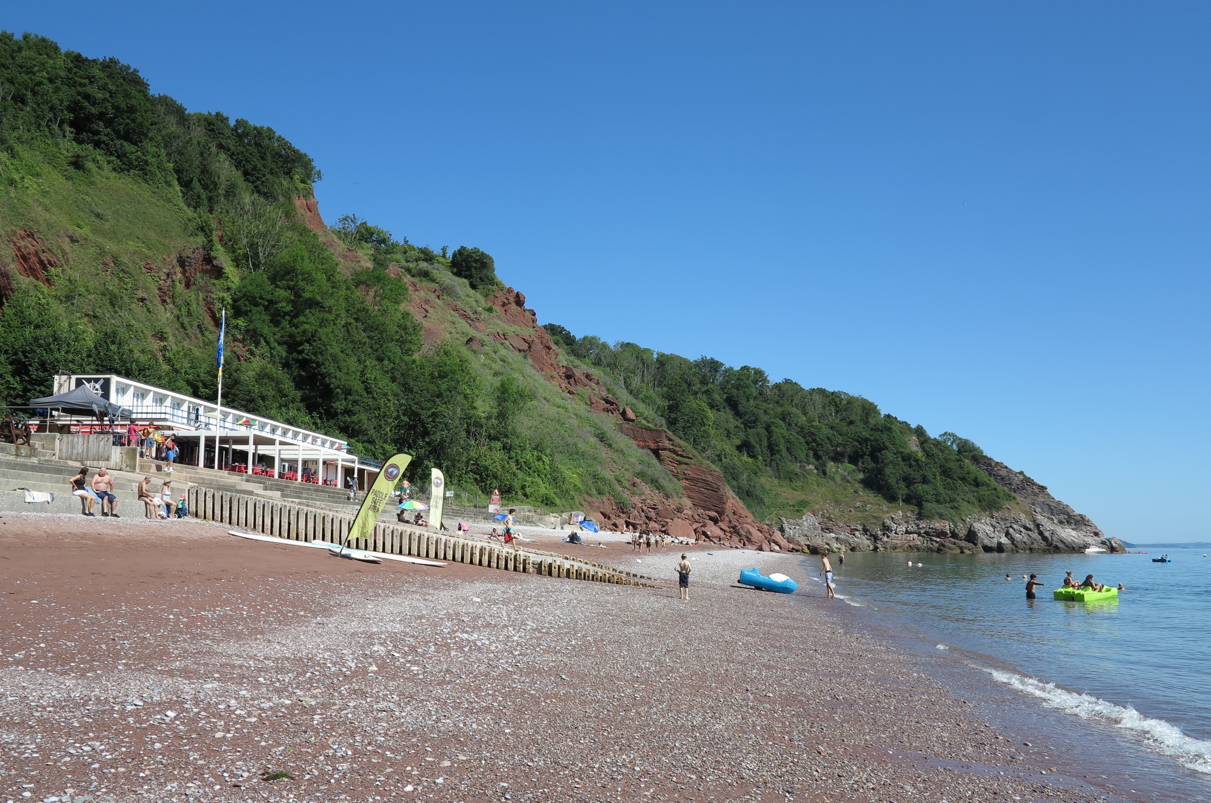 Babbacombe is a town to the north of Torquay. Below the cliffs at Babbacombe are two beaches, Babbacombe Beach which is a small pebble beach and Oddicombe Beach which is a long red sandy beach. Above the cliffs, there is a nice green with restaurants and cafés. The Babbacombe cliff railway provides a quick route from the cliffs to Oddicombe Beach, but there are also footpaths down and a small car park by Babbacombe Beach. Torquay is 24 miles from Exeter on the A38 and A380. At Torquay follow the A3022 to the Torquay sea front and then take the A379 north to Babbacombe. There are also car parks above the cliffs and limited road parking.