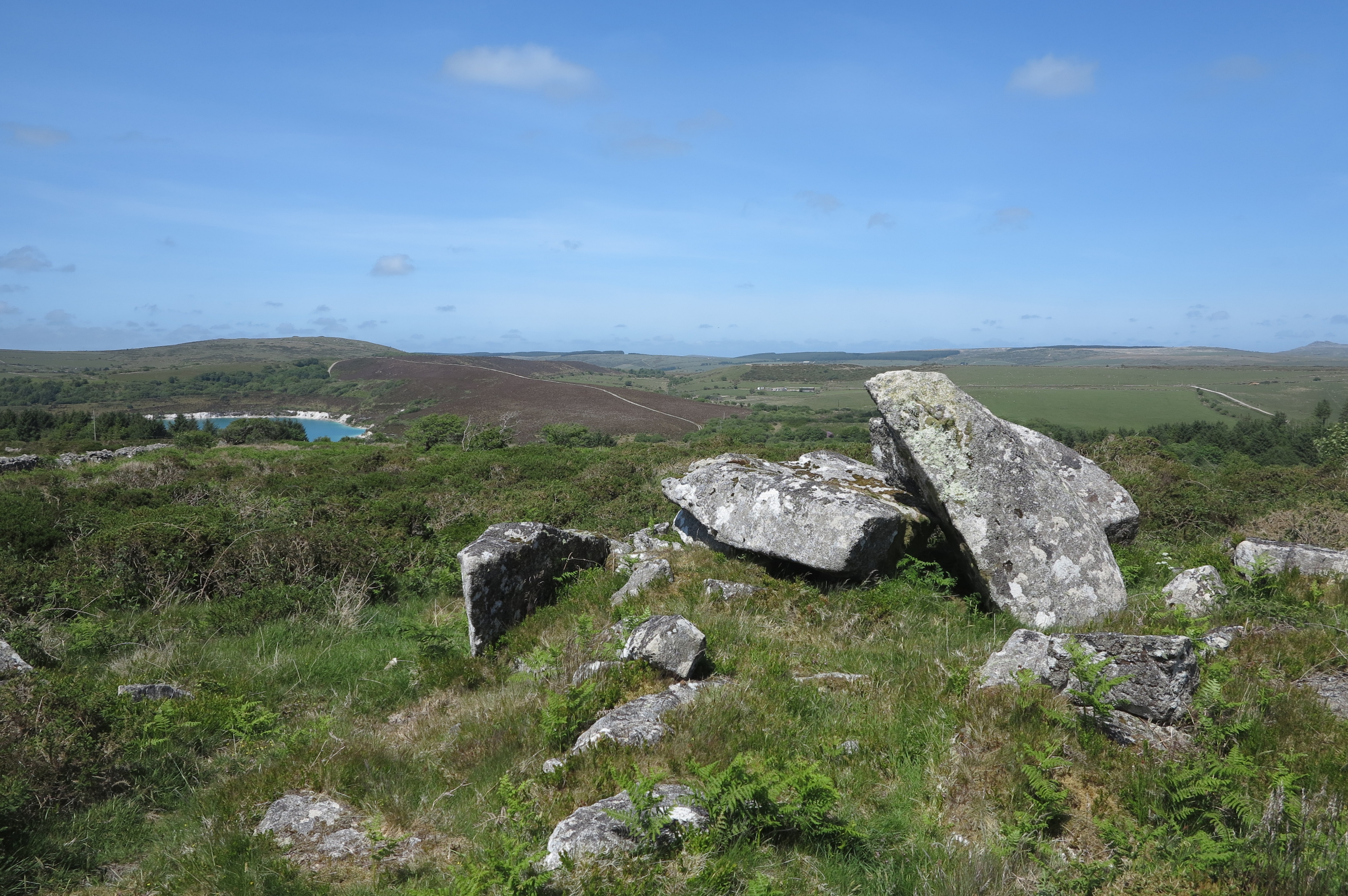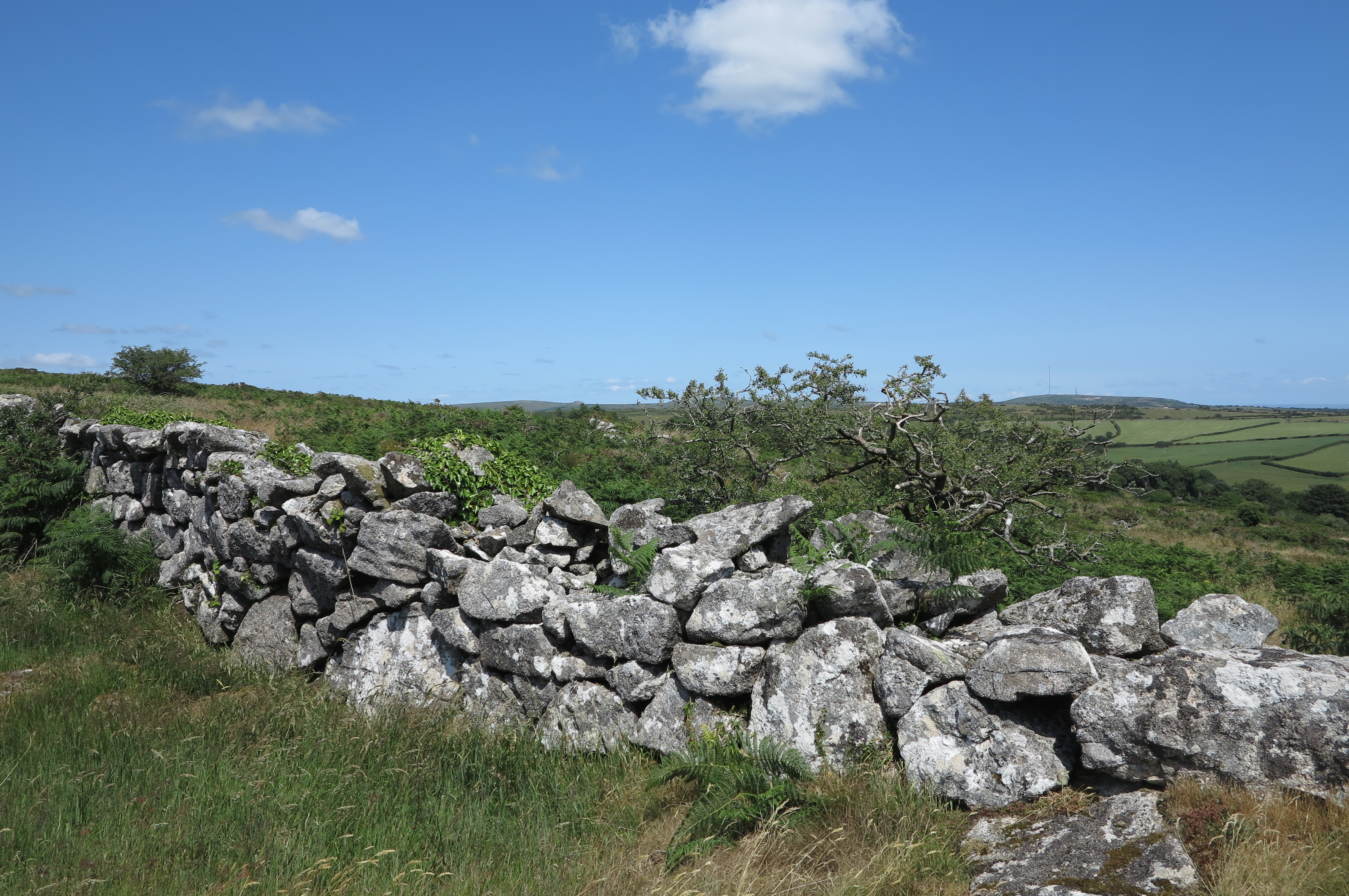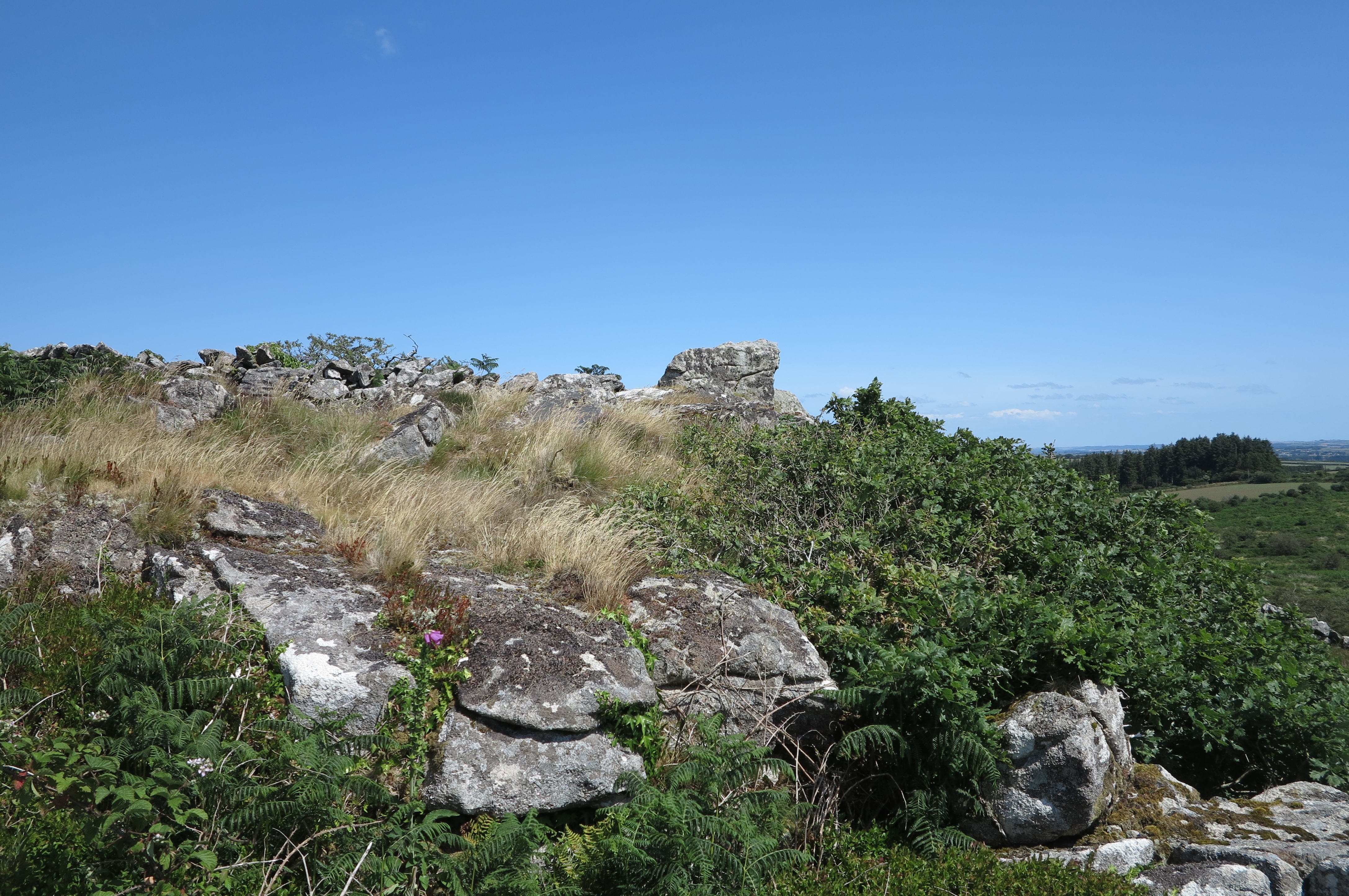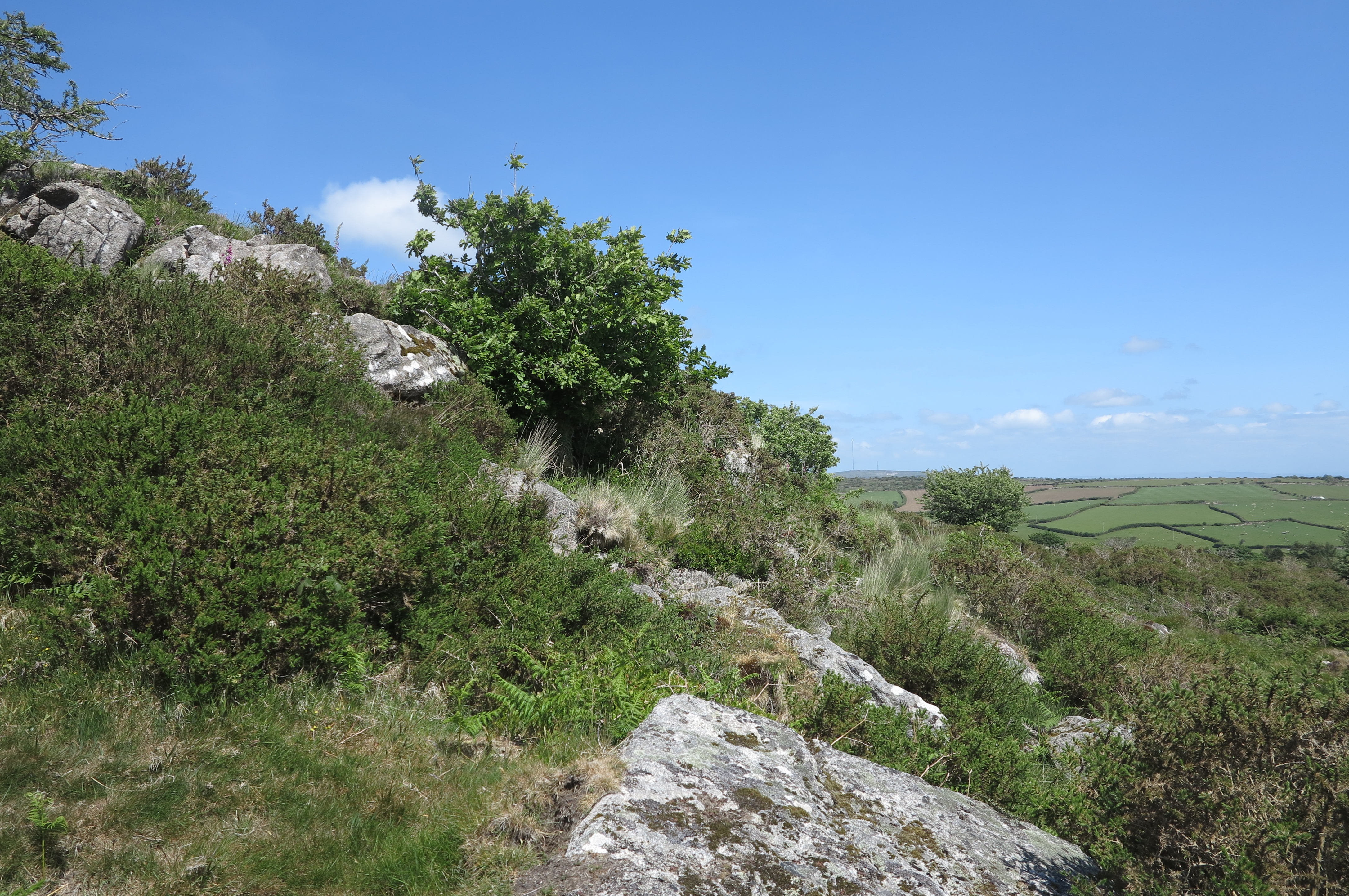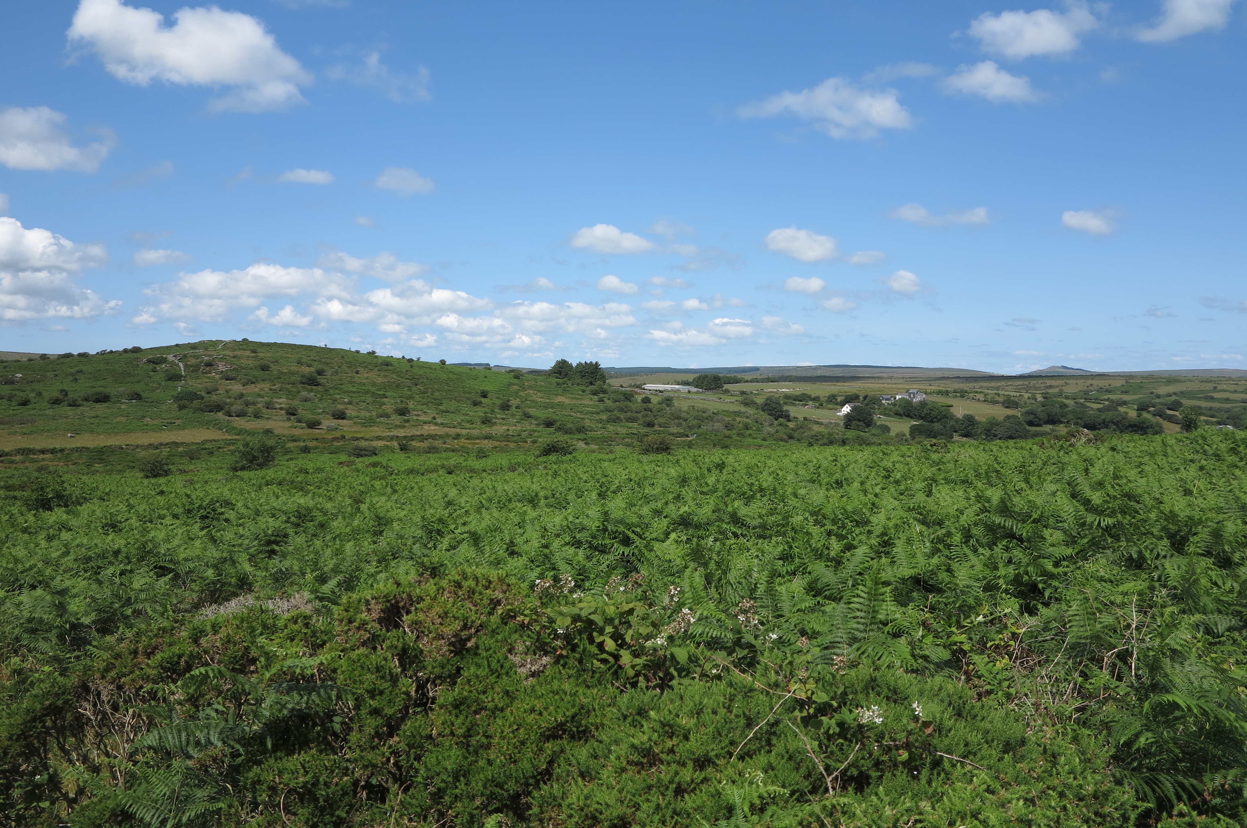 Muttons Downs is a small area of open access moorland on the southern edge of Bodmin Moor, north of St Neot. There is a turning to St Neot on the A38, west of Liskeard and Dobwalls. At St Neot, turn right where signposted to St Cleer and take the next left signposted to Colliford Lake. Muttons Downs can be accessed from paths on this road. There is very limited parking on this road with a small layby which can be used for parking (but note that it is also used for storing gravel). Park in the layby and walk on the road north for about five minutes until on the right there is a signposted public footpath, which leads to moorland with Muttons Downs to the north. Note that there is no clear path to the top of Muttons Downs and it can be difficult to reach the top of the downs due to rocks and bracken.