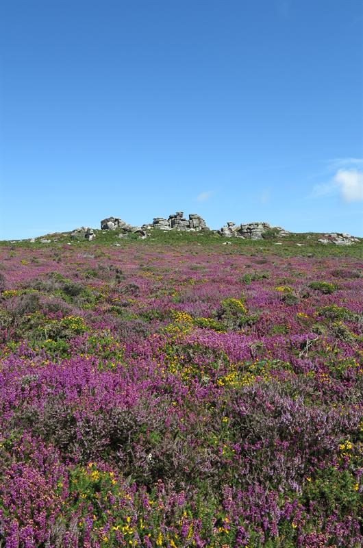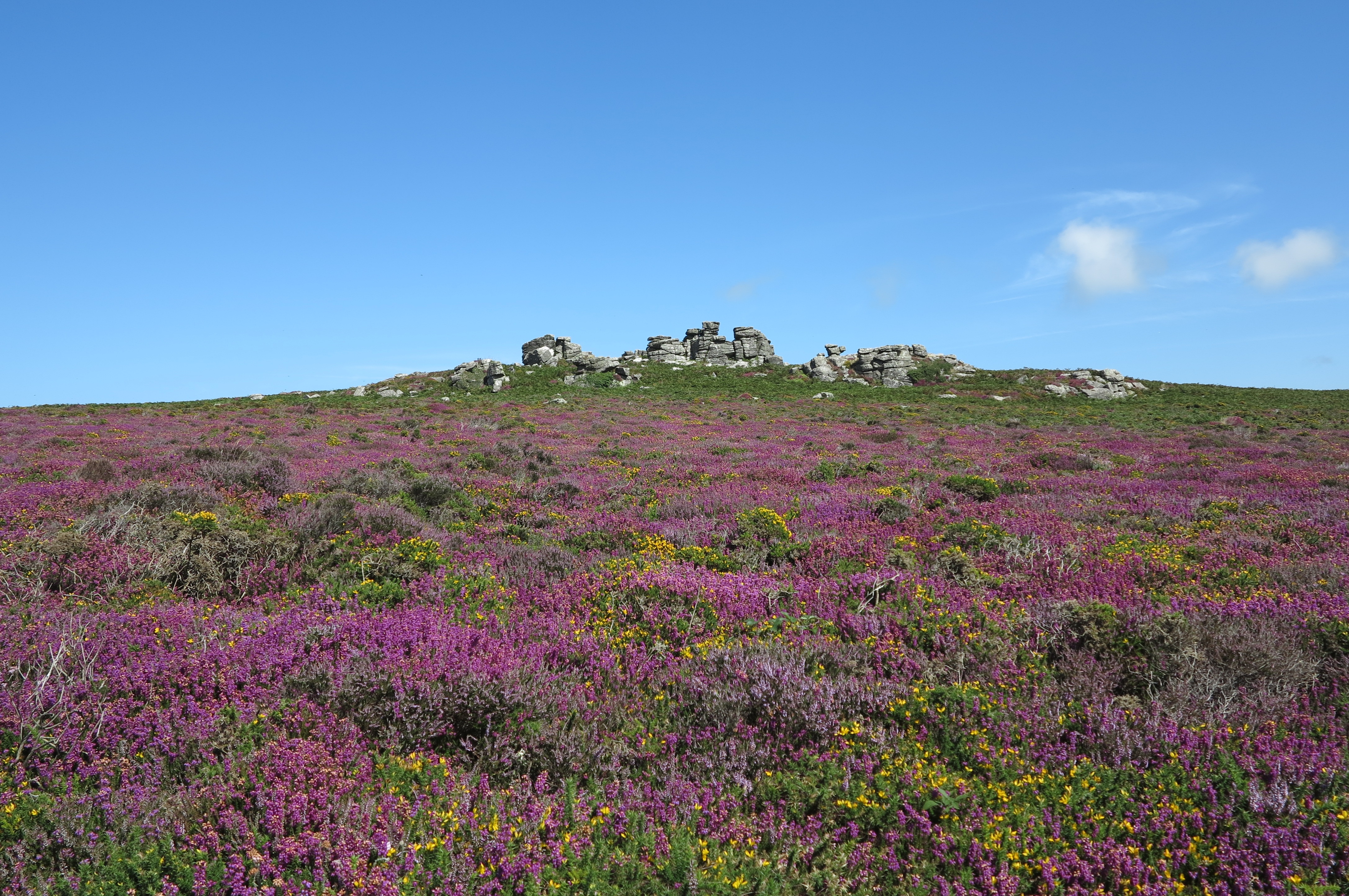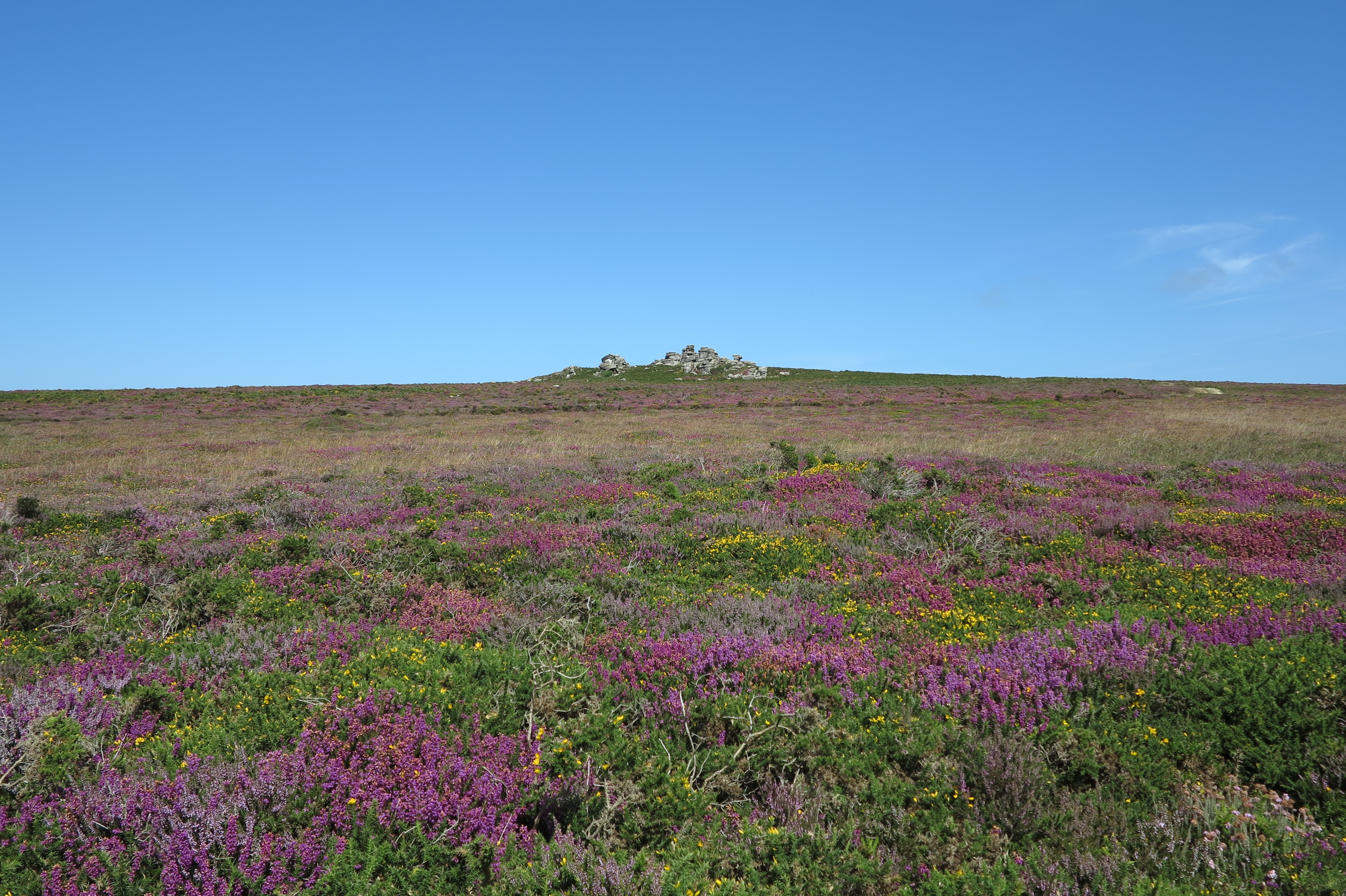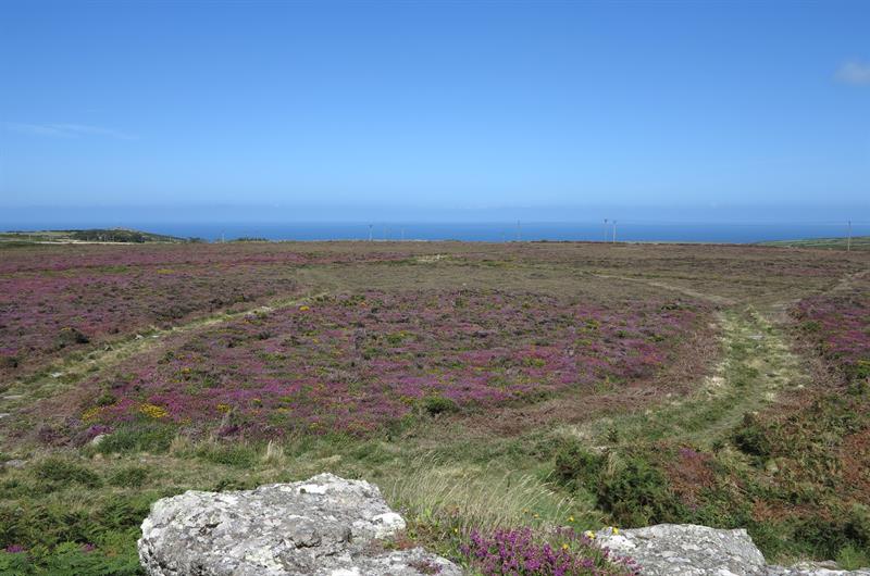 Carn Kenidjack is a large rock outcrop on an area of open moorland called Carnyorth Common in West Cornwall. There are a number of trails around the common and a number of entrances to the common. The quickest route to Carn Kenidjack is from a small layby on the B3318 road. In Penzance at the Mount Misery roundabout, take the A3071 road signposted to St Just. After 5 or 6 miles turn right onto the B3318 where signposted to Pendeen. After a couple of miles, there is a left turning signposted to Trewellard and opposite this turning is a small layby car park. Park in the car park and then walk along the road opposite the car park. Take the next left along a lane. The lane bends to the right and then bends to the left. Where the lane bends to the left there is a track that allows access to Carnyorth Common.