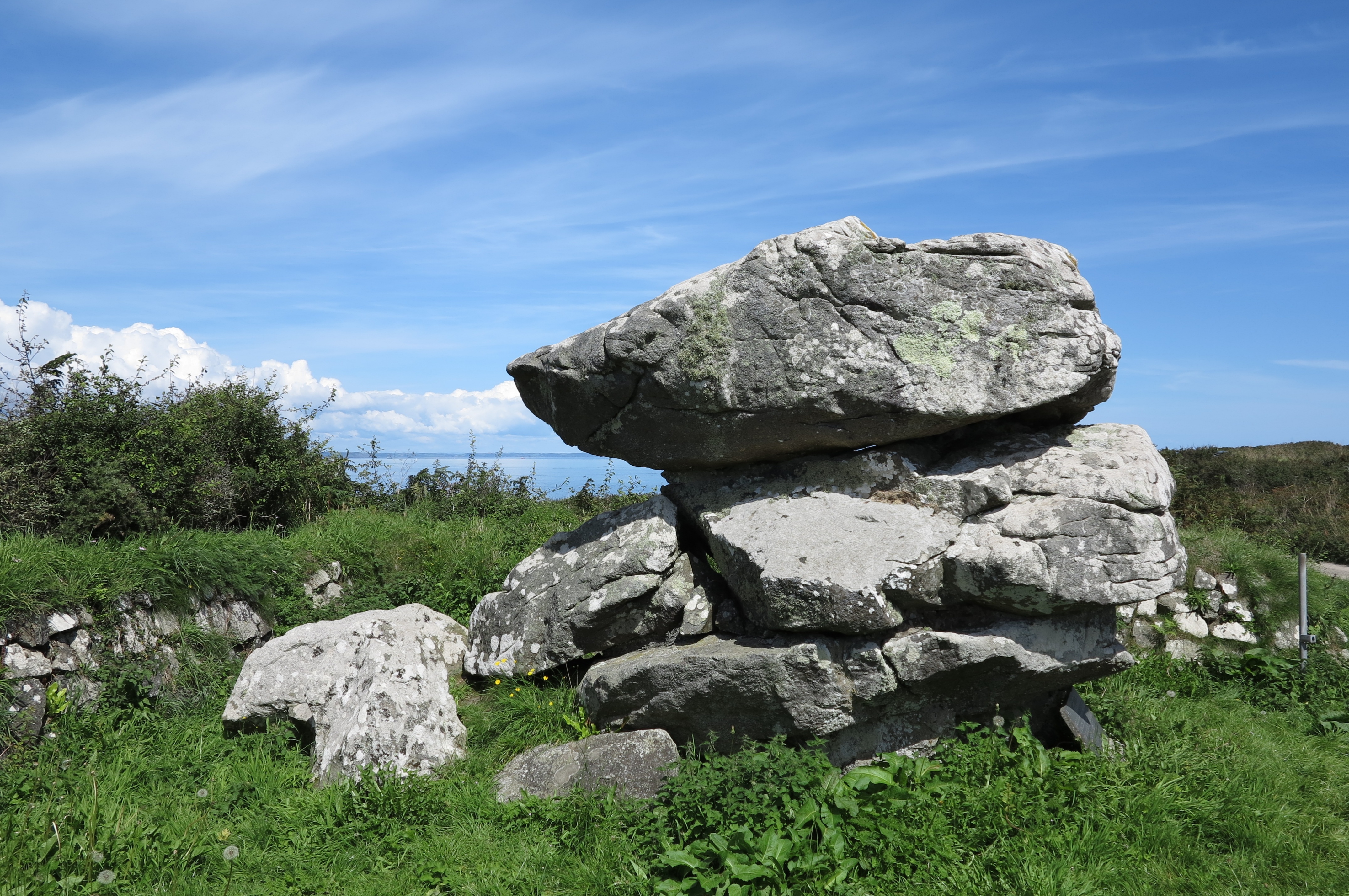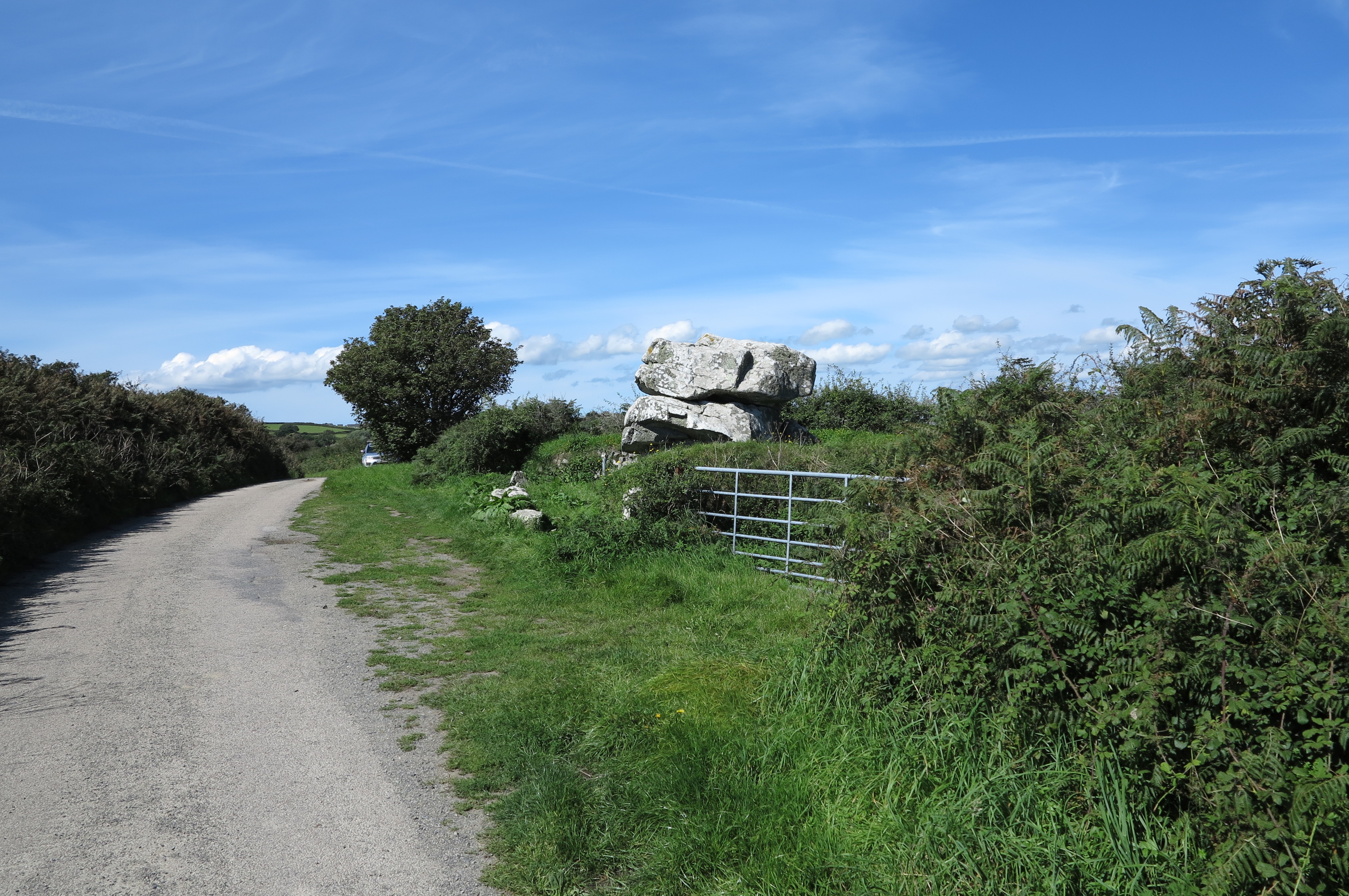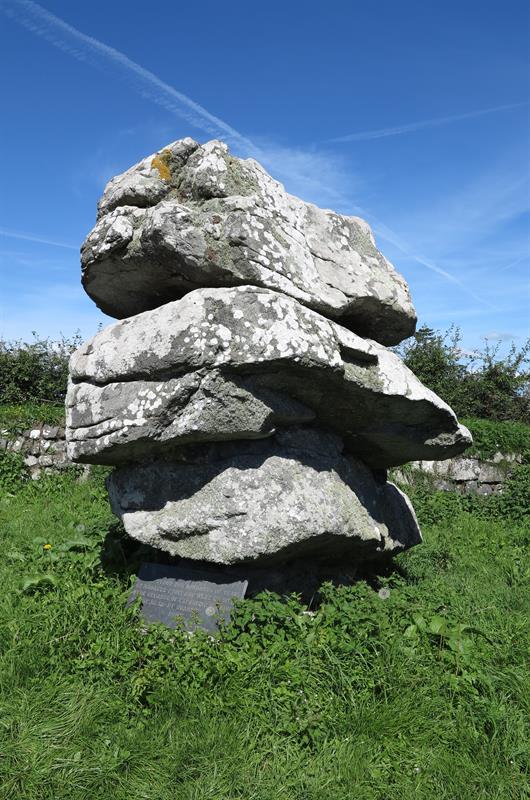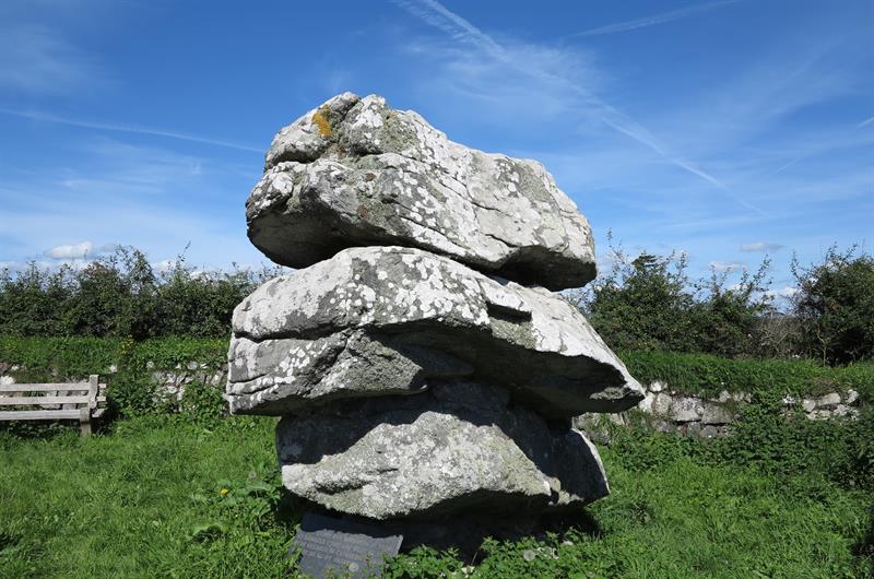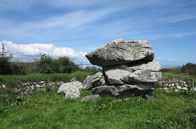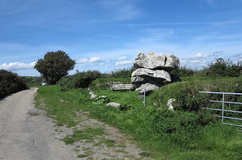 Giants Quoit near Rosenithon is not a burial chamber but a rock outcrop that originally stood at Manacle Point and had to be moved inland due to quarrying work. Giants Quoit is on the roadside a short distance east of Rosenithon. There is no parking at Rosenithon, the nearest car park is at Porthoustock, which is about 13 miles from Helston. At Helston take the A3083 to Lizard, after Culdrose turn left onto the B3293 and follow the signs to St Keverne and Porthoustock. From Porthoustock walk the coast path south, note that the coast path is on roads to Rosenithon (follow signs for "Coast Path Inland Route").