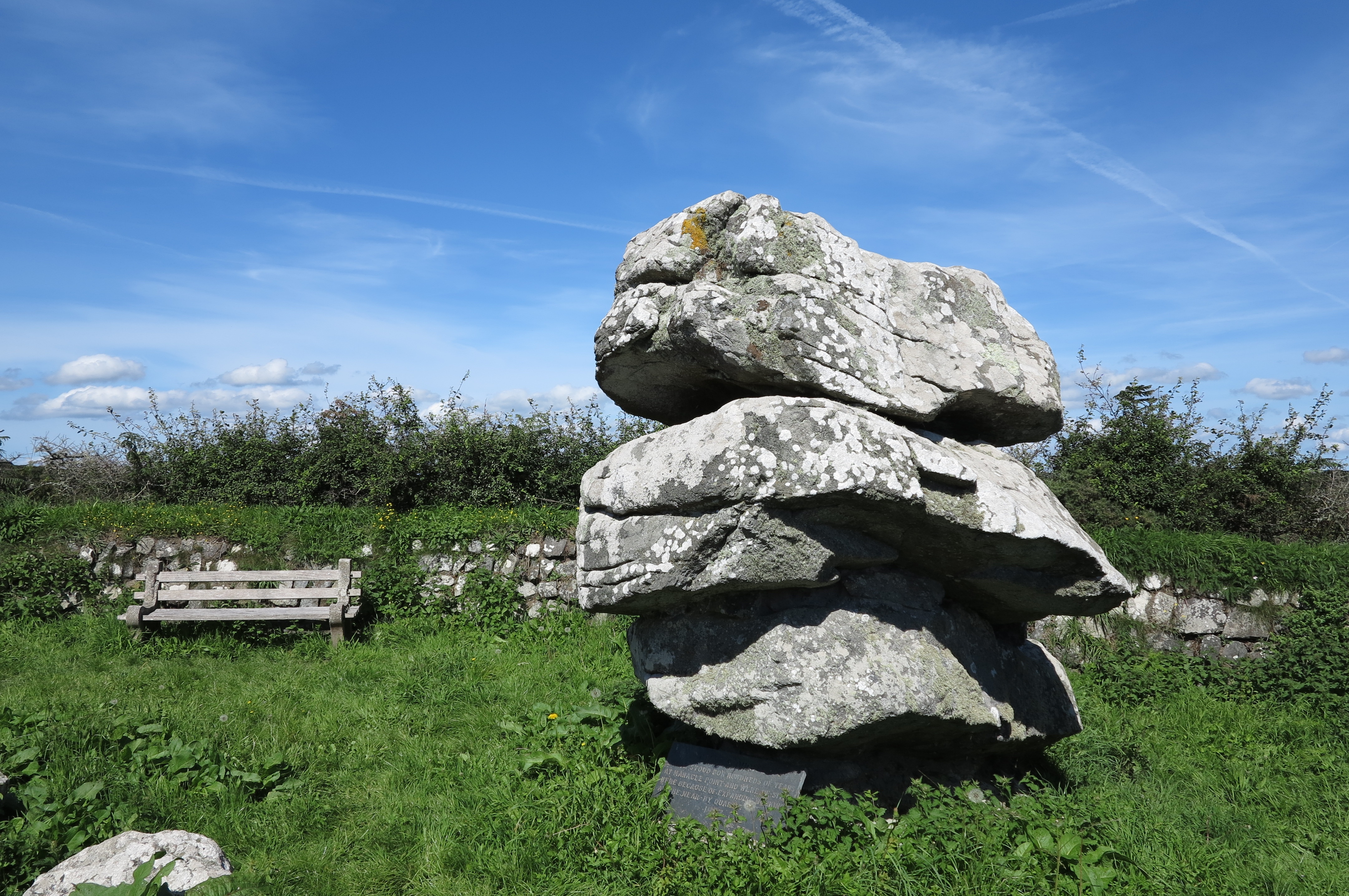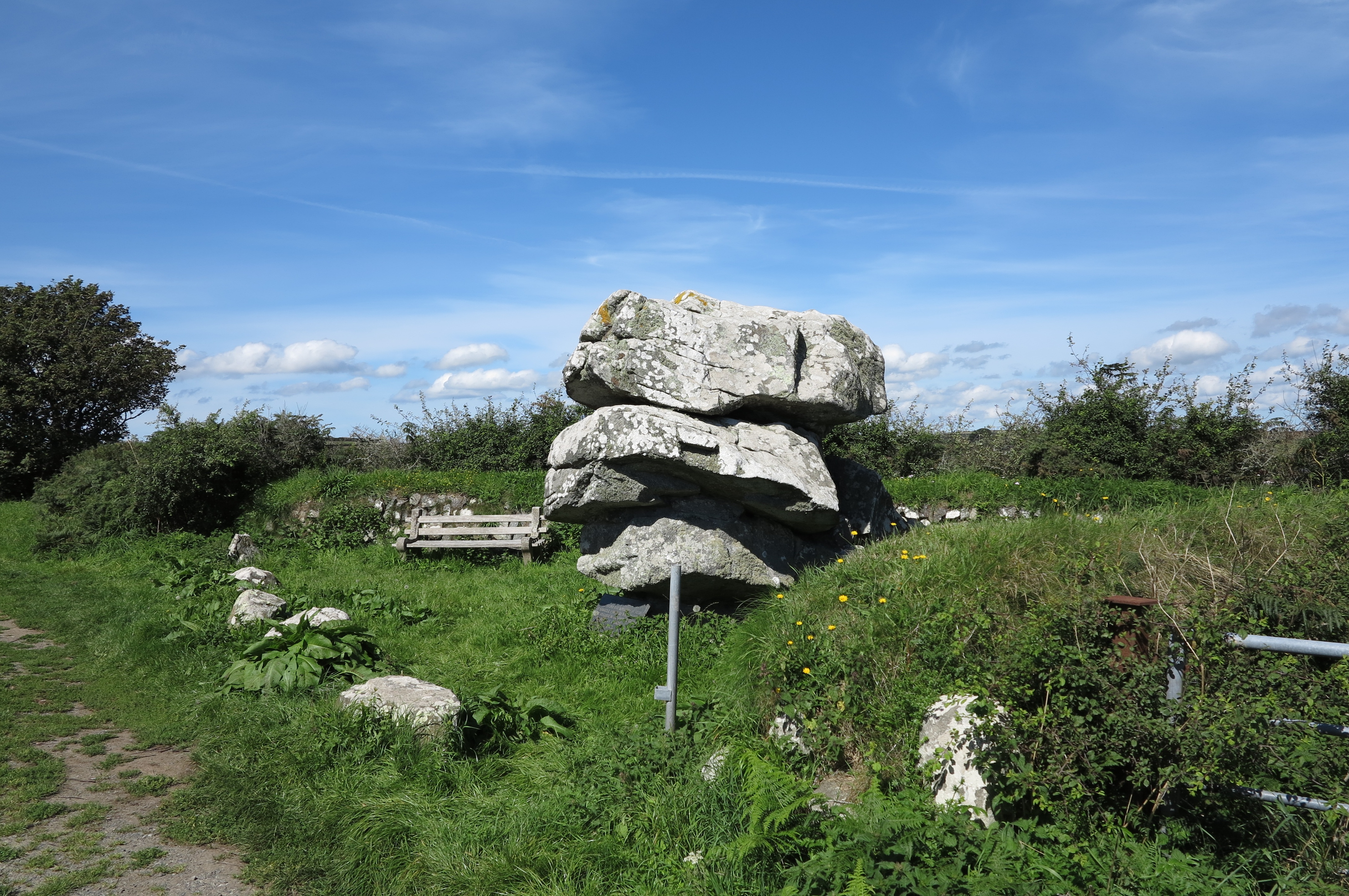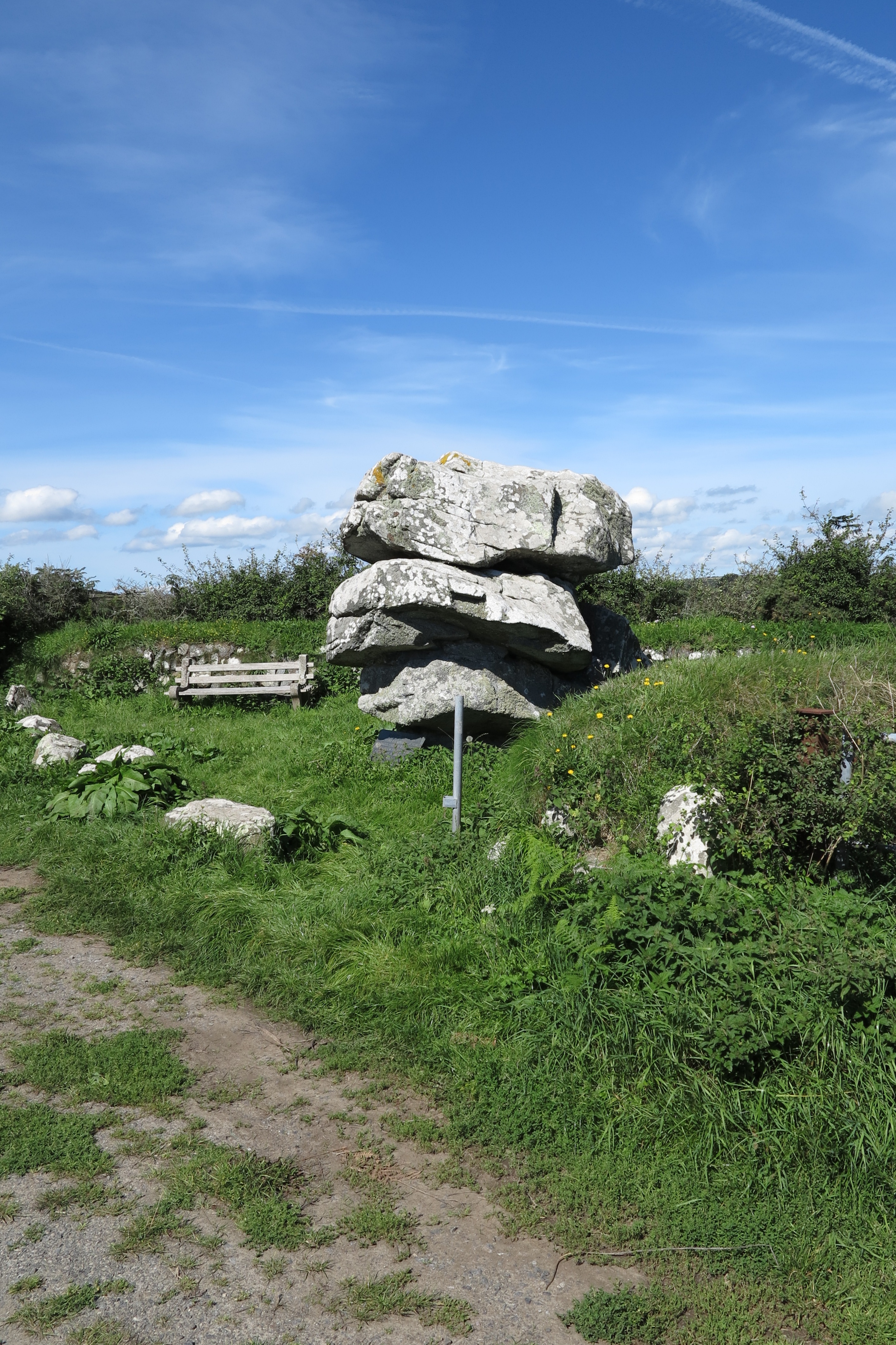 Giants Quoit near Rosenithon is not a burial chamber but a rock outcrop that originally stood at Manacle Point and had to be moved inland due to quarrying work. Giants Quoit is on the roadside a short distance east of Rosenithon. There is no parking at Rosenithon, the nearest car park is at Porthoustock, which is about 13 miles from Helston. At Helston take the A3083 to Lizard, after Culdrose turn left onto the B3293 and follow the signs to St Keverne and Porthoustock. From Porthoustock walk the coast path south, note that the coast path is on roads to Rosenithon (follow signs for "Coast Path Inland Route").