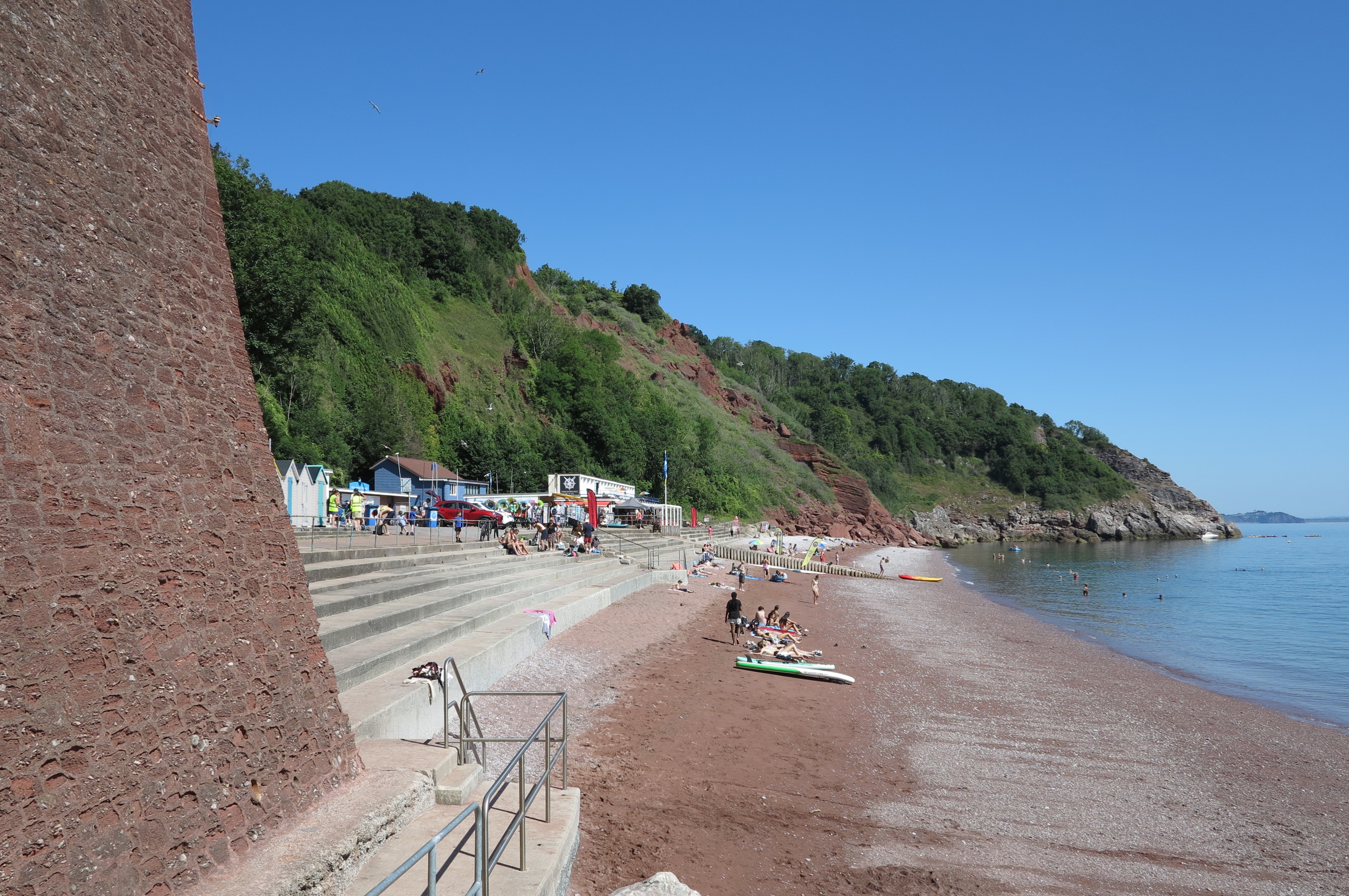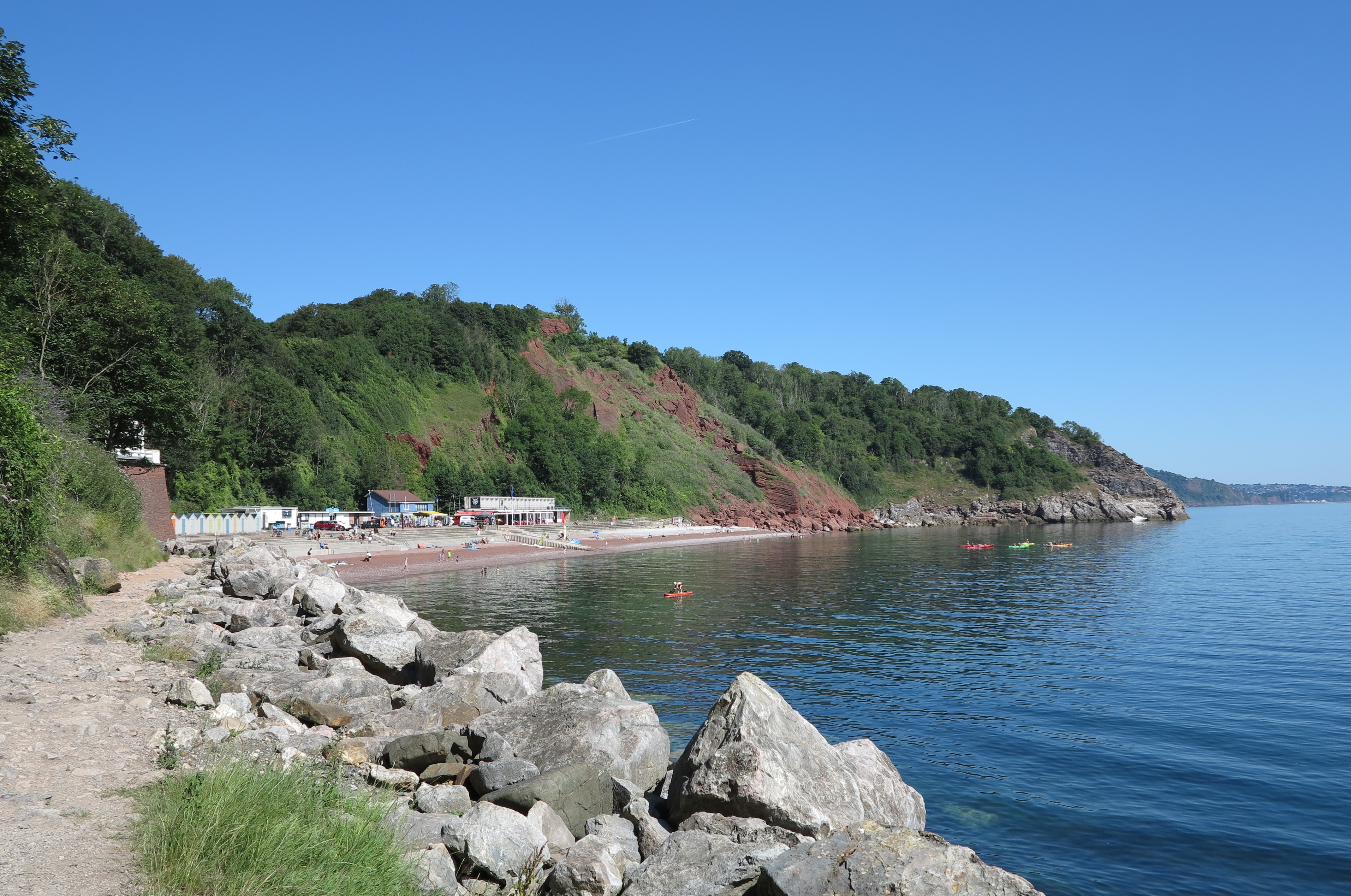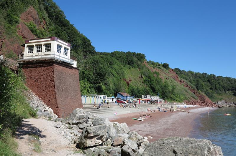 Babbacombe is a town to the north of Torquay. Below the cliffs at Babbacombe are two beaches, Babbacombe Beach which is a small pebble beach and Oddicombe Beach which is a long red sandy beach. Above the cliffs, there is a nice green with restaurants and cafés. The Babbacombe cliff railway provides a quick route from the cliffs to Oddicombe Beach, but there are also footpaths down and a small car park by Babbacombe Beach. Torquay is 24 miles from Exeter on the A38 and A380. At Torquay follow the A3022 to the Torquay sea front and then take the A379 north to Babbacombe. There are also car parks above the cliffs and limited road parking.